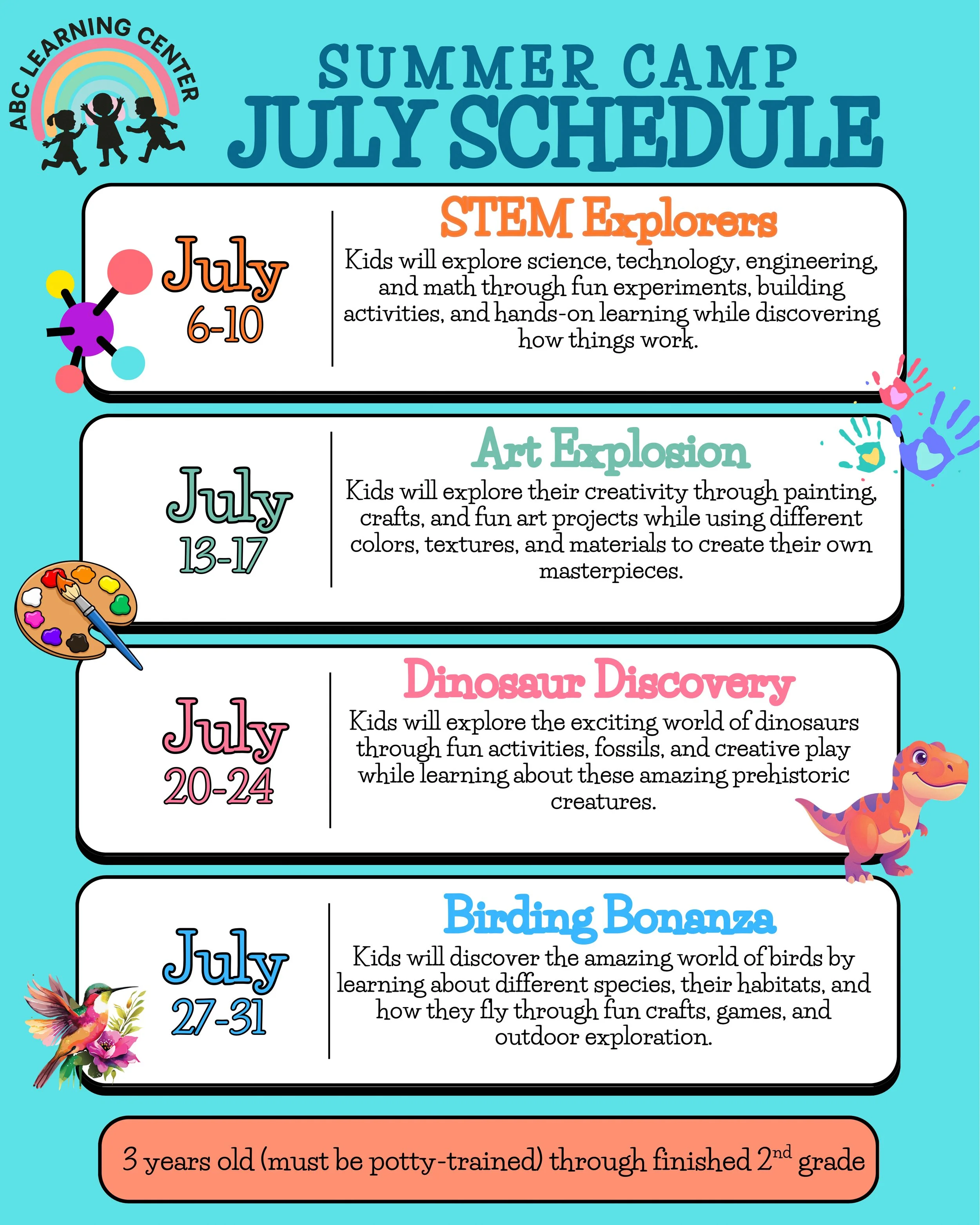 In order to better serve our community, ABC Learning Center is excited to introduce our First Ever Summer Enrichment Camps for 2026! Our summer program will offer children a fun, engaging, and enriching environment filled with hands-on learning, creative exploration, and plenty of play.
